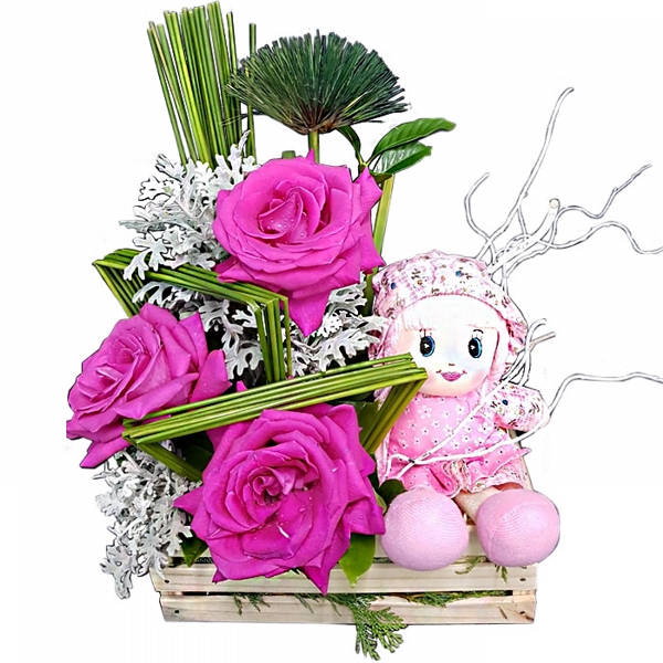 A chegada da nova bebe é um momento muito especial para ser comemorado de forma plena e para esta ocasião premiadíssima preparamos este lindo arranjo com 3 Rosas Pink decorada com uma lindíssima bonequinha Cor de Rosa.